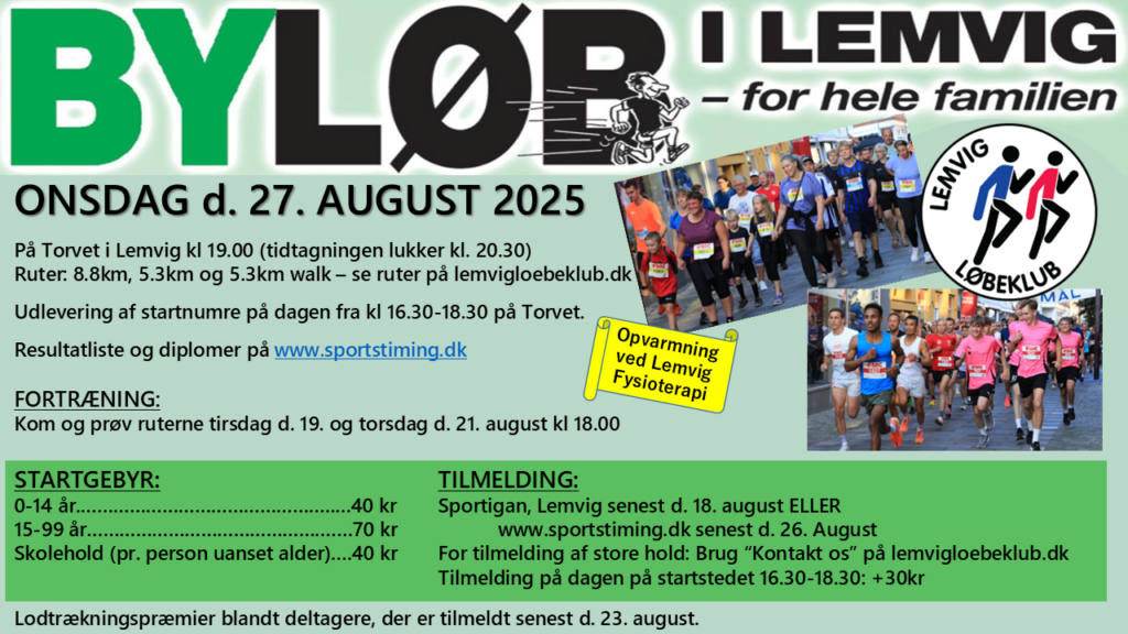 Onsdag d. 27. august afholder vi vores årlige byløb, hvor det er muligt at løbe eller gå 5,3km eller 8,8km.